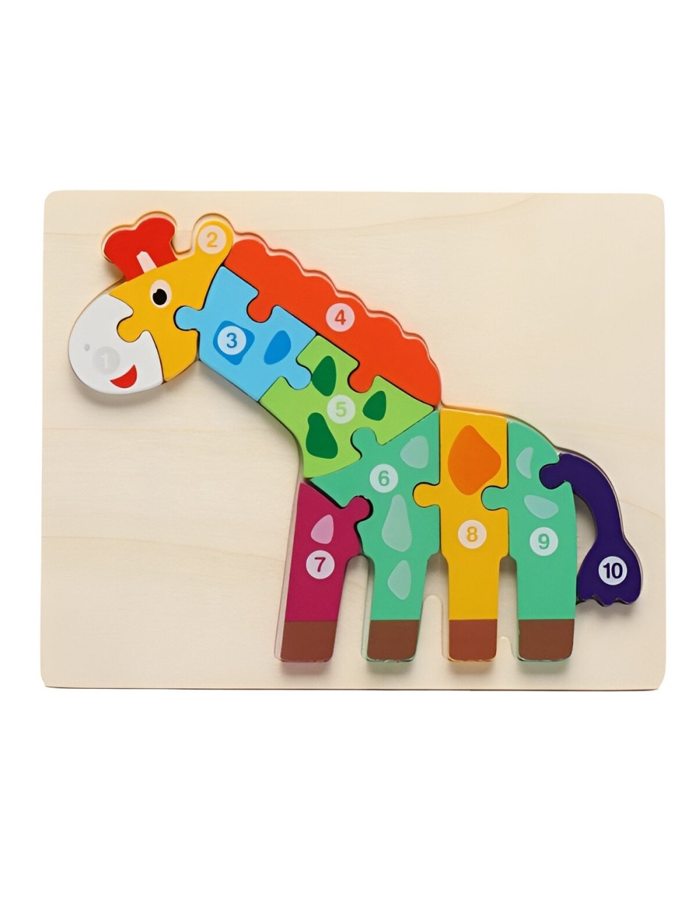 Rompecabezas en madera compuesto por piezas numeradas que facilitan el armado y ayudan a niñas y niños a desarrollar la concentración, la memoria y el reconocimiento de números, al mismo tiempo que estimulan la coordinación ojo-mano y el pensamiento lógico a través de un juego educativo y entretenido.