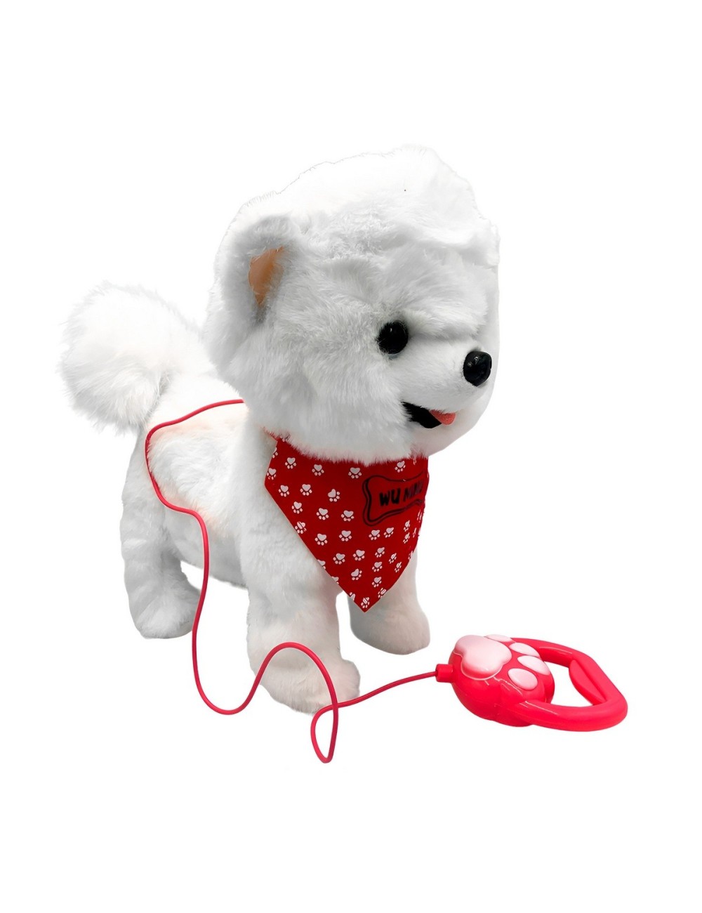 Adorable perrito interactivo de peluche que camina y mueve la cola con ayuda de su control en forma de huella, diseñado con un suave pelaje y un pañuelo colorido que lo hace aún más tierno; ideal para que las niñas disfruten de su primera mascota, fomentando el juego de roles, el cuidado y la diversión en un entorno seguro.