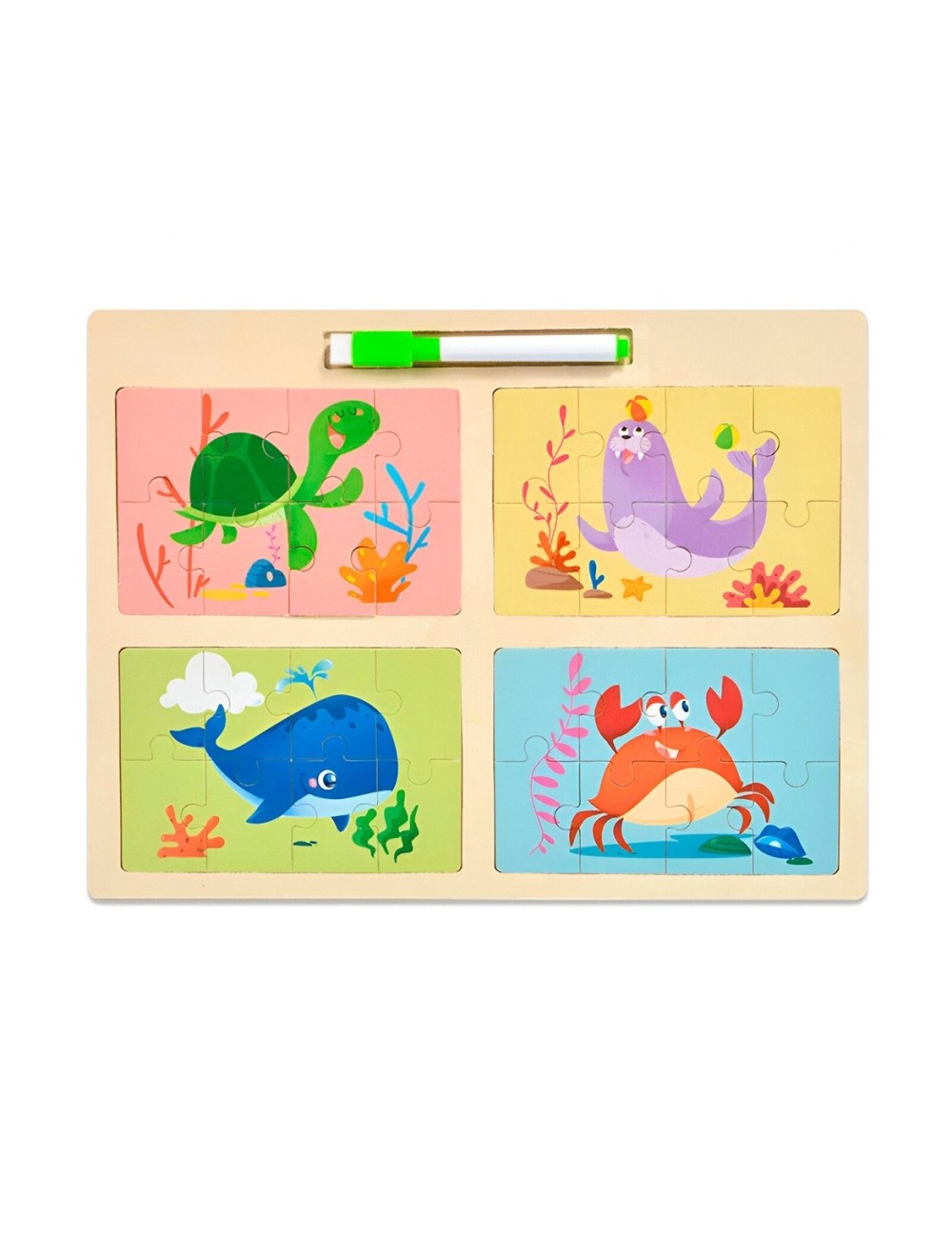 Multiplica la diversión y el aprendizaje con este versátil tablero de madera 4 en 1, la actividad perfecta para mentes curiosas. Tu pequeño explorador se deleitará resolviendo no uno, sino cuatro encantadores y coloridos rompecabezas, cada uno protagonizado por un simpático personaje diferente, ideales para desarrollar la motricidad fina, la concentración y las habilidades de resolución de problemas. Pero la creatividad no tiene límites, ya que este tablero de doble función también incluye un marcador borrable para que, una vez terminados los puzzles, puedan usar la superficie para dibujar, escribir y expresar su imaginación una y otra vez. Es el juguete perfecto que combina el desafío de los rompecabezas con la libertad del arte en un formato compacto y duradero.
