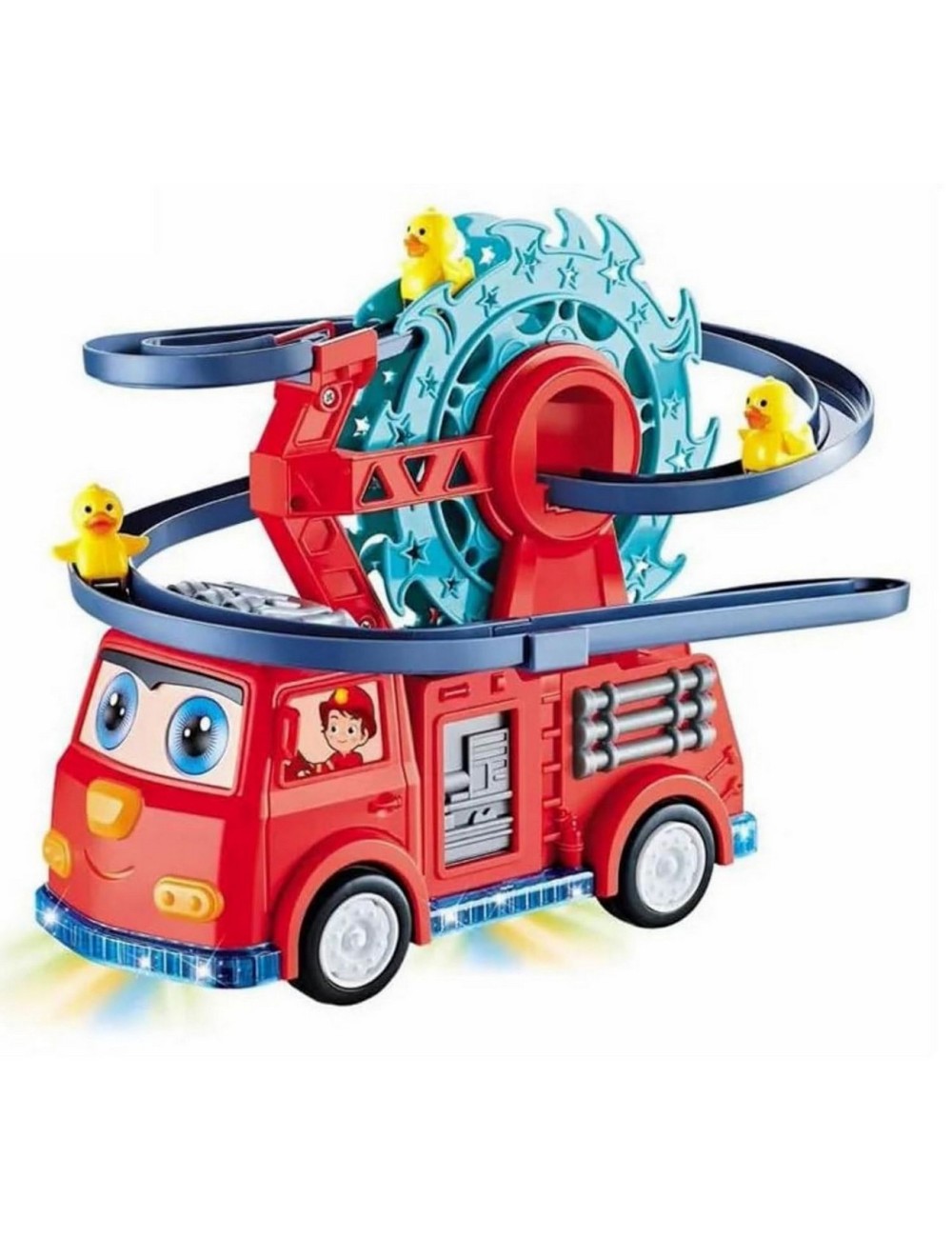 Este innovador juguete combina la acción de un camión de bomberos con la diversión de una montaña rusa en miniatura, donde unos adorables patitos se mueven de un lado al otro en la parte superior. Con sonidos, luces y movimiento automático, este camión de bomberos no solo ofrece rescates emocionantes, sino también un espectáculo visual y auditivo que garantiza horas de entretenimiento para los niños.